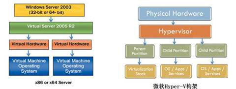 Hyper-V与其他的虚拟化平台相比,突出的特点就是精简了结构提高了性能,下面我们用Virtual Server作为传统虚拟化技术的代表与Hyper-V进行对比。Hyper-V和Virtual Server虽然同为微软的服务器虚拟化产品,却有着很显著的区别:Hyper-V在构架上已经完全不同于后者,可以说是微软在虚拟化技术上的一个突破性进展。从图中我们很容易看到他们的区别。